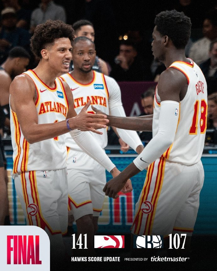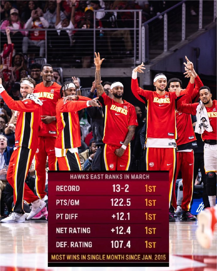 杰伦-约翰逊稳定发挥,首发登场27分钟,全场12投6中,三分2中1,罚球7中5,得到18分11篮板5助攻1抢断。值得一提的是,由于老鹰三月份战绩达到了13胜2负,杰伦-约翰逊场均可以得到22.4分8.5篮板8.5助攻的全面数据,因此当选为东部月最佳球员。